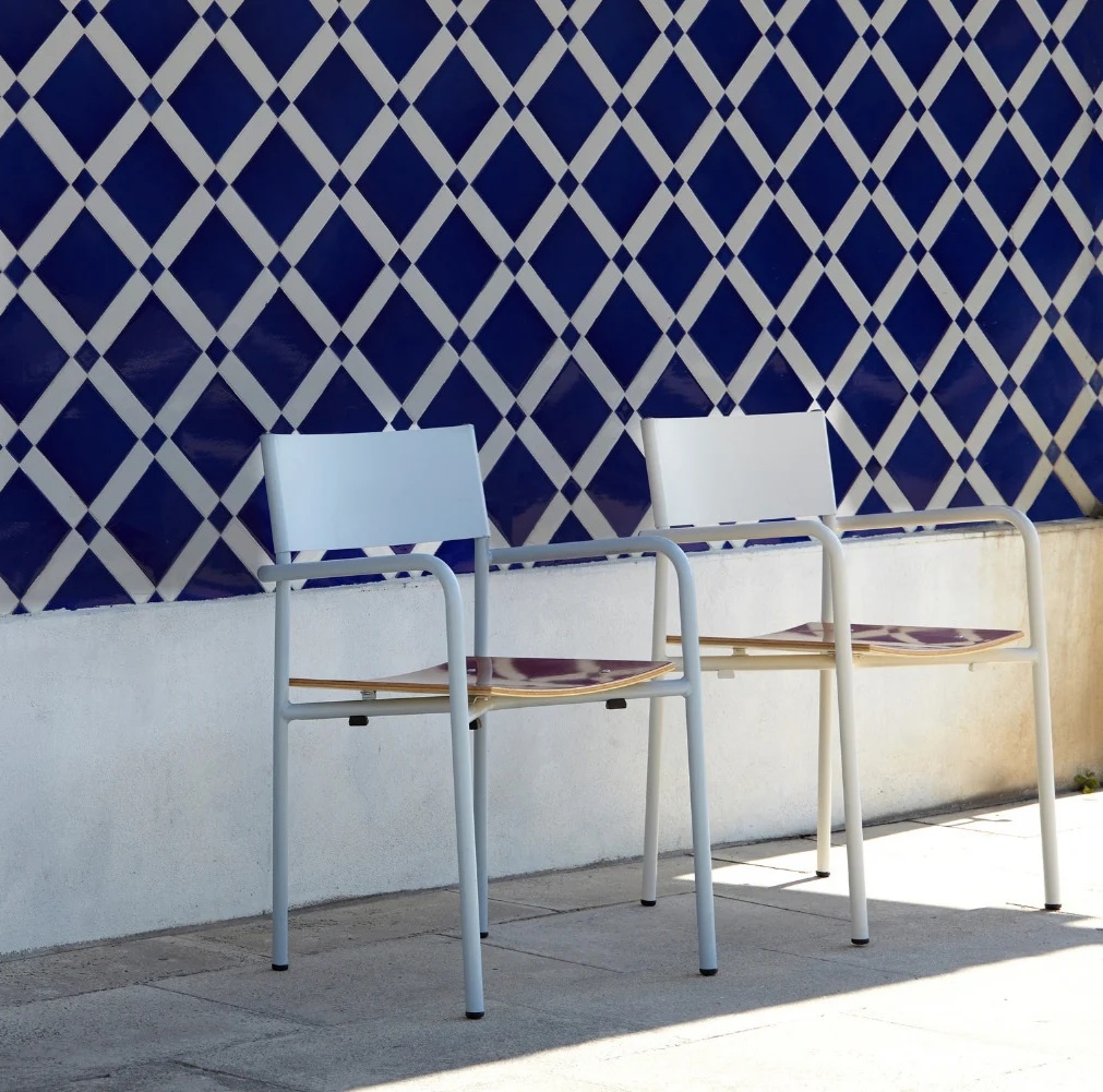 De Adico Realizador terrasstoel: Dit project komt voort uit een interpretatie van de traditionele metalen stoel van de directeur, vervaardigd in hout en canvas. De lichtheid van de metalen structuur hercreëert het massieve hout; de combinatie van het zitgedeelte in gevormd multiplex in de vorm van de metalen rugleuning vertegenwoordigde het canvas. Het comfort en de eenvoud van het ontwerp maken de ruimtes sober en origineel.