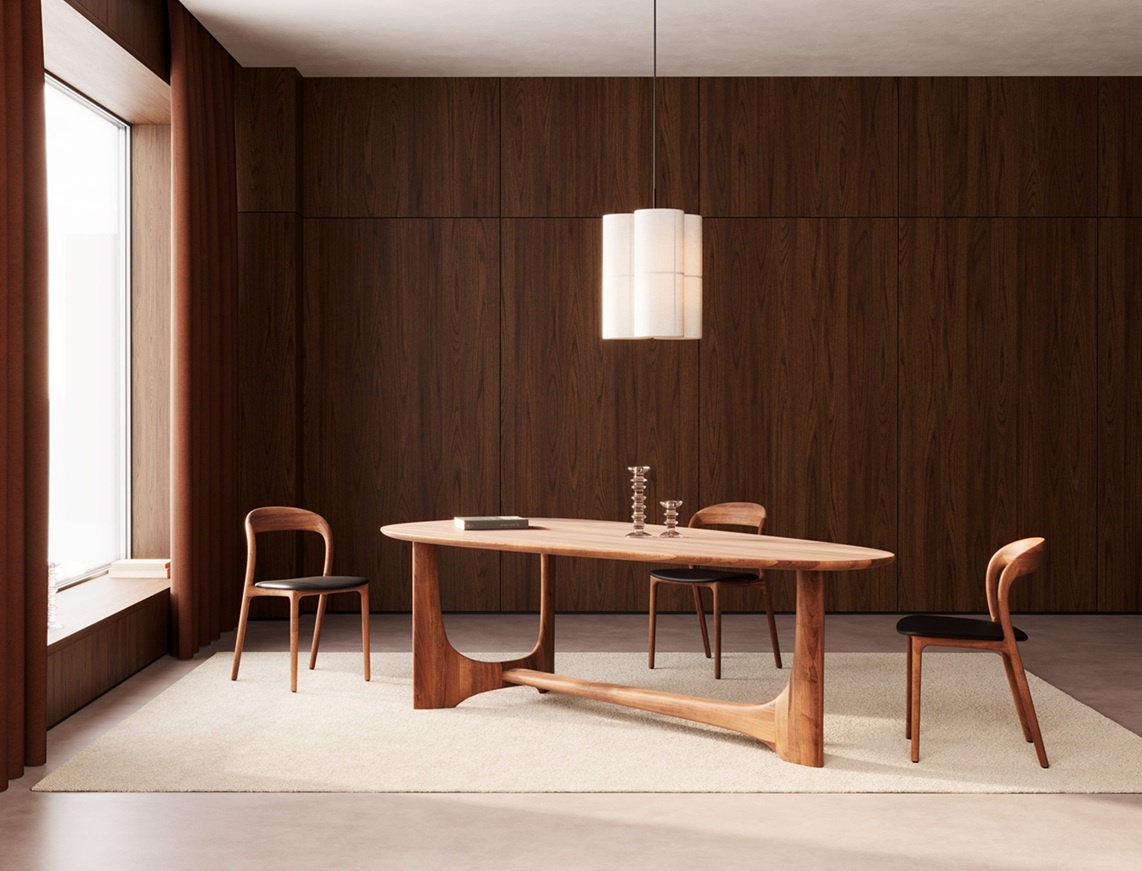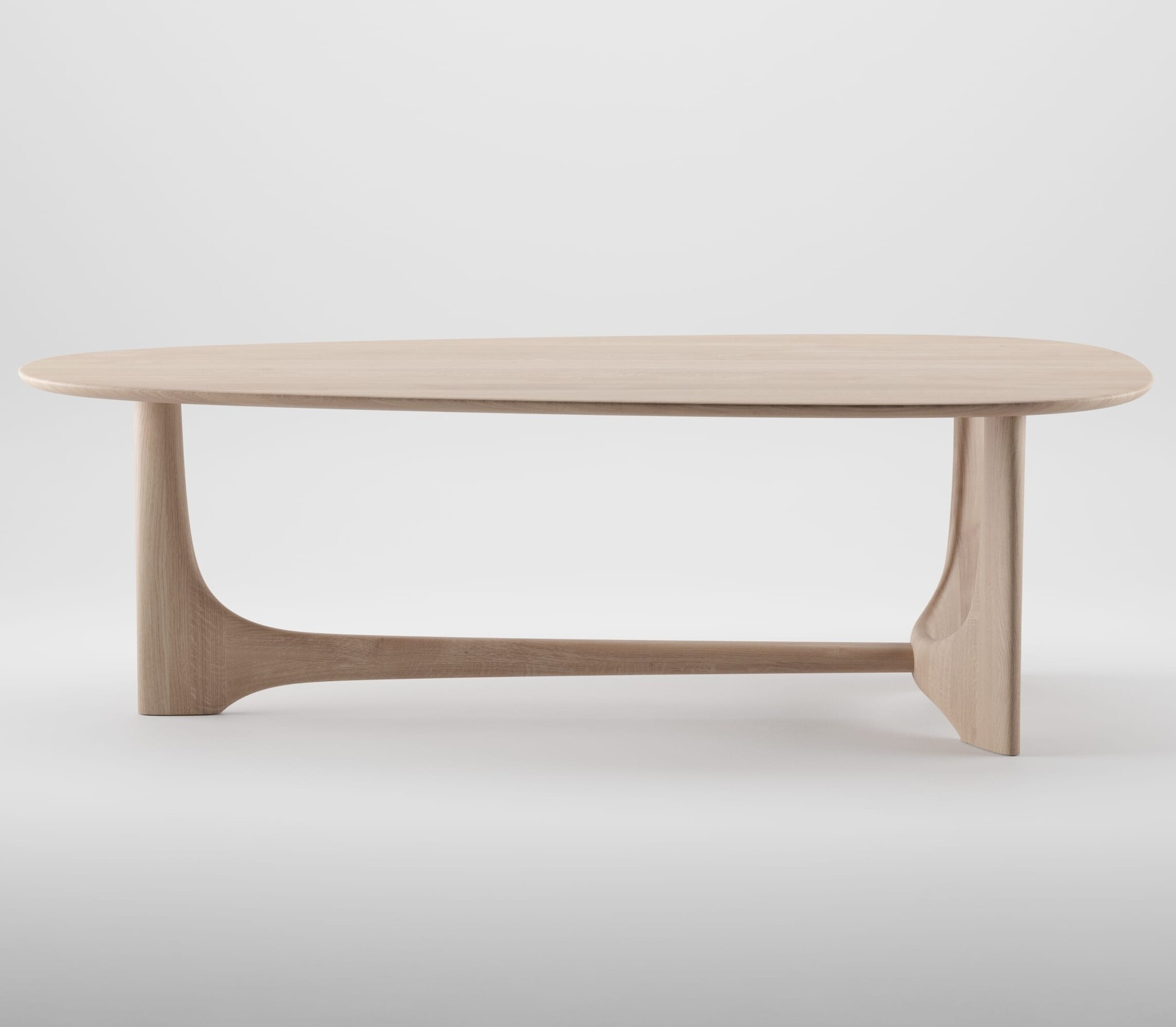 De Oskar-collectie van Artisan omvat tafels en consoles van massief hout, die zich onderscheiden door sculpturale poten geïnspireerd op modernistische kolomontwerpen uit Brasília. Vloeiende overgangen tussen horizontale en verticale elementen creëren een architectonisch silhouet dat zowel waardig als ingetogen is. Elk stuk is gemaakt van zorgvuldig geselecteerd massief hout, nauwkeurig gefreesd en afgewerkt door de bekwame vakmensen van Artisan. Het ontwerp is voorzien van een knock-down constructie voor gemakkelijk transport zonder dat dit ten koste gaat van de stabiliteit. De tafels hebben een ovaalvormig tafelblad met een prominente zitplaats aan één kant, wat op een subtiele manier verwijst naar de sociale hiërarchie op een positieve en respectvolle manier.