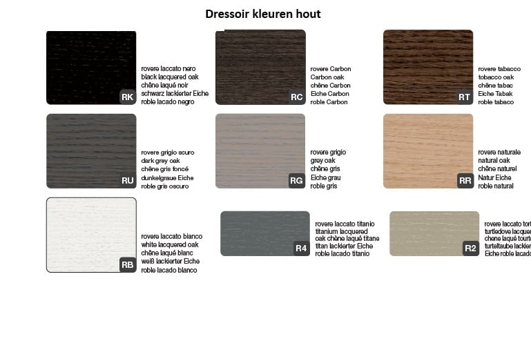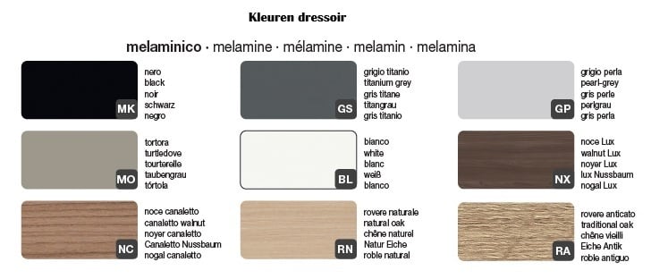 Het dressoir is verkrijgbaar in 18 verschillende kleuren, waarbij de achterkant van het dressoir in de kleuren wit of zwart leverbaar is.