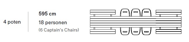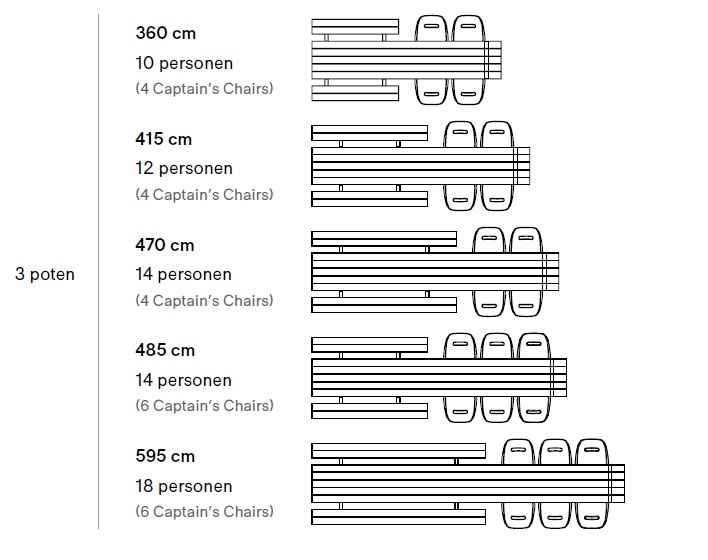 De Marina Combo is verkrijgbaar met 3 of 4 poten. Bij 3 poten is er een vaste bank aan 1 kant (aan weerszijden van de tafel) en daarnaast ruimte voor losse stoelen aan beide kanten van de tafel. Bij 4 poten zijn er 2 banken aan weerszijden van de tafel en ruimte voor stoelen in het midden van de tafel, aan beide kanten. Een goede optie voor de stoelen is de "captains chair" uit de Extremis collectie. Voor meer informatie "klik hier". De tafel wordt exclusief de captain's chairs geleverd.