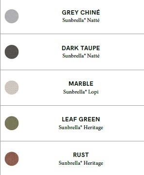 De tafel is leverbaar in 4 kleuren. De All Weather kussens van Extremis gemaakt voor de Marina Combo banken zijn er in 5 heerlijke kleuren en kunnen, zoals wenselijk bij outdoor meubels, tegen een regenbui. Een groot voordeel: de kussens kunnen met een band aan de banken vastgemaakt worden, waardoor verschuiven en op de grond vallen van de kussens tot het verleden behoort.