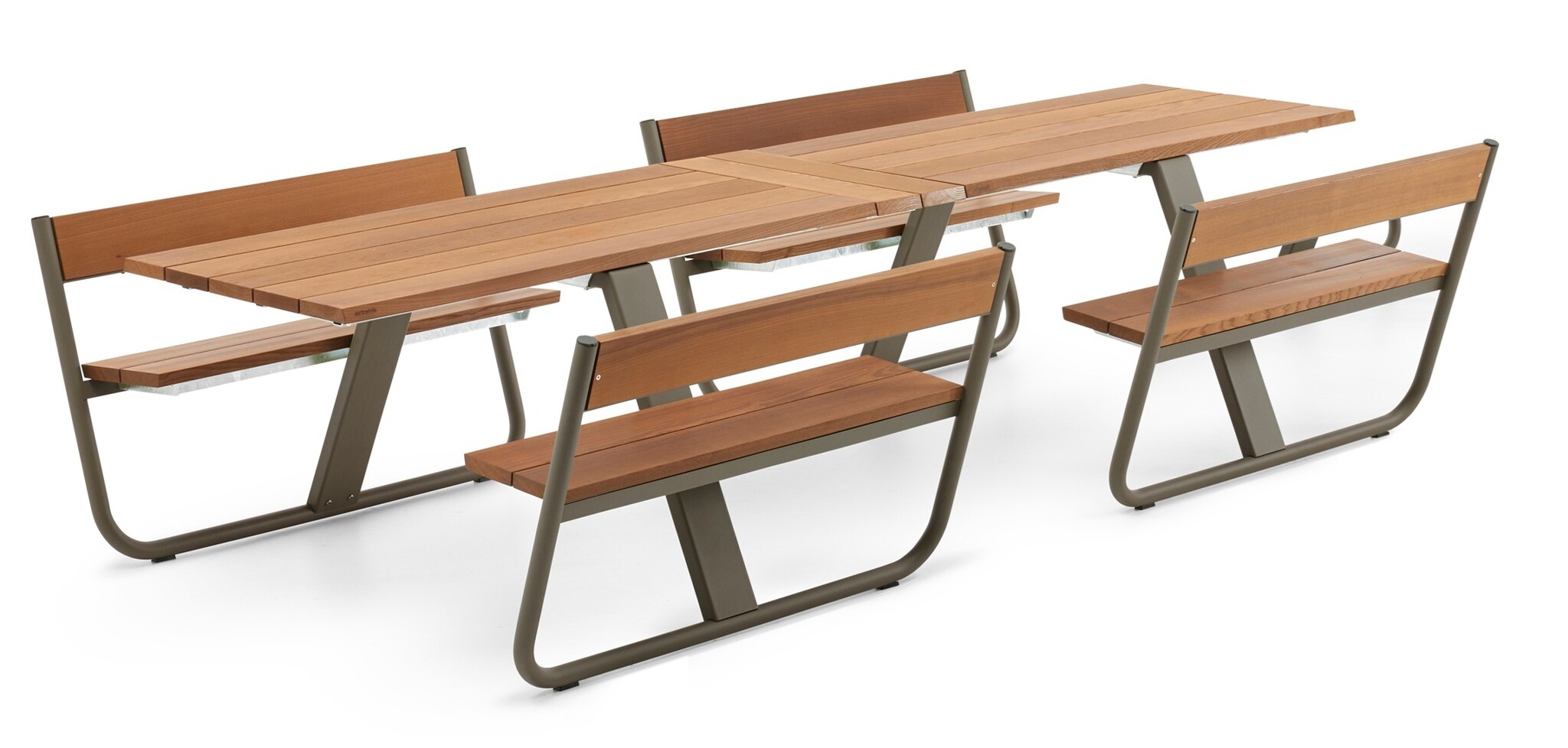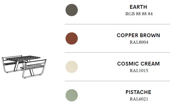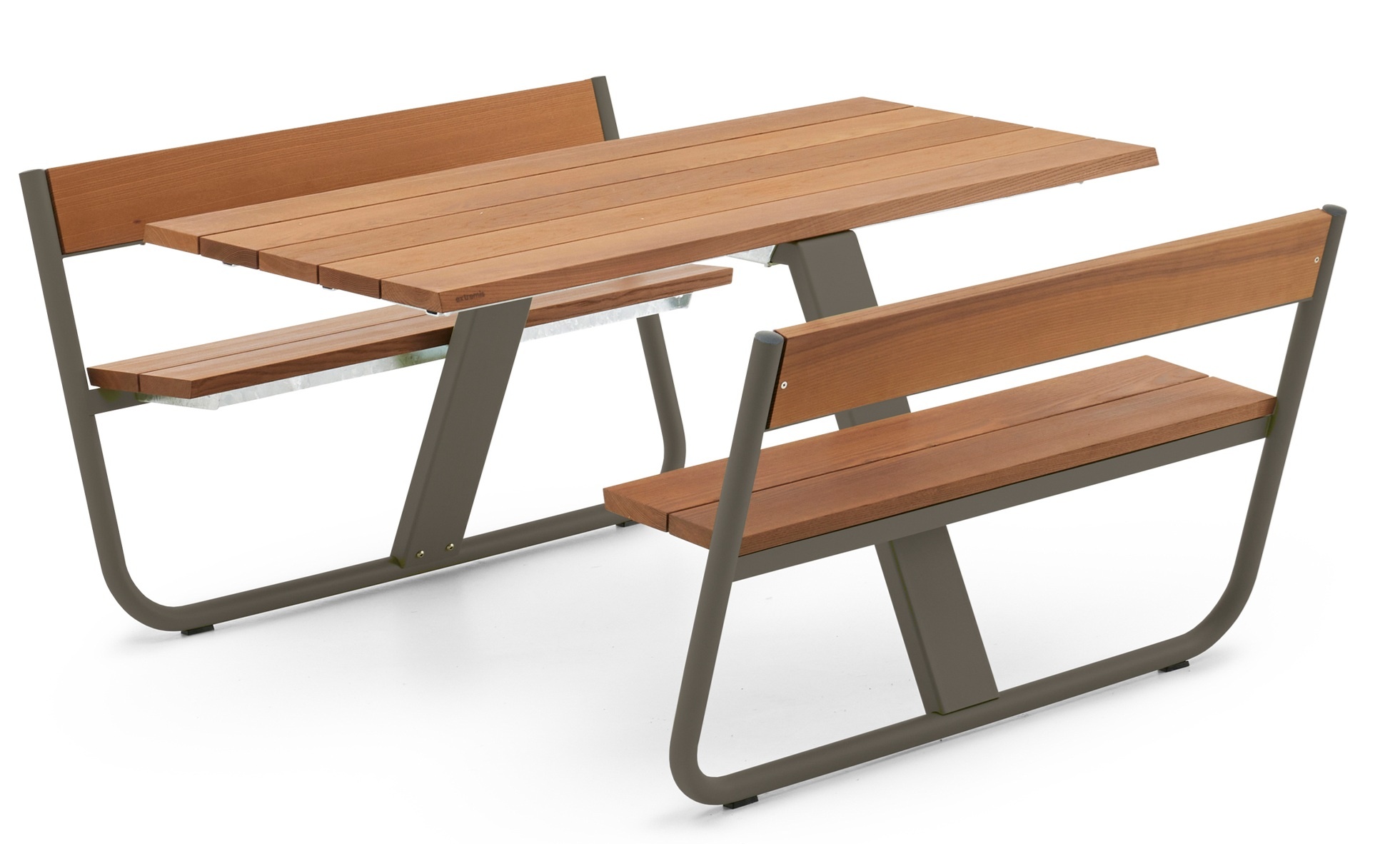 Poten van gestructureerd gepoedercoat roestvrijstaal, thermisch verzinkt stalen frame en Hellwood-tafelblad & banken.