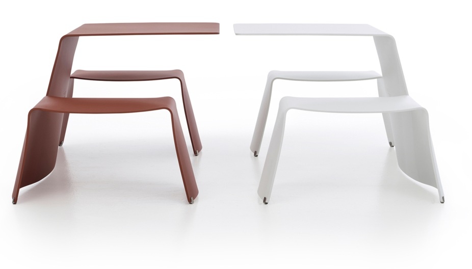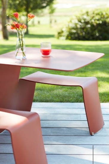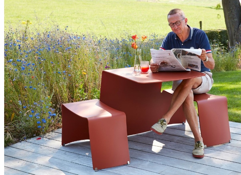 De Extremis Picnik is gemaakt van een massieve plaat aluminium die in de juiste vorm gesneden en geplooid wordt, zonder enig afval te maken. Twee personen kunnen comfortabel plaatsnemen aan deze picknicktafel, die ook bestand is tegen de guurste weersomstandigheden. De Picnik illustreert perfect hoe vorm en functie hand in hand gaan. Het blijft dan ook een echte designklassieker van de Extremis-collectie.