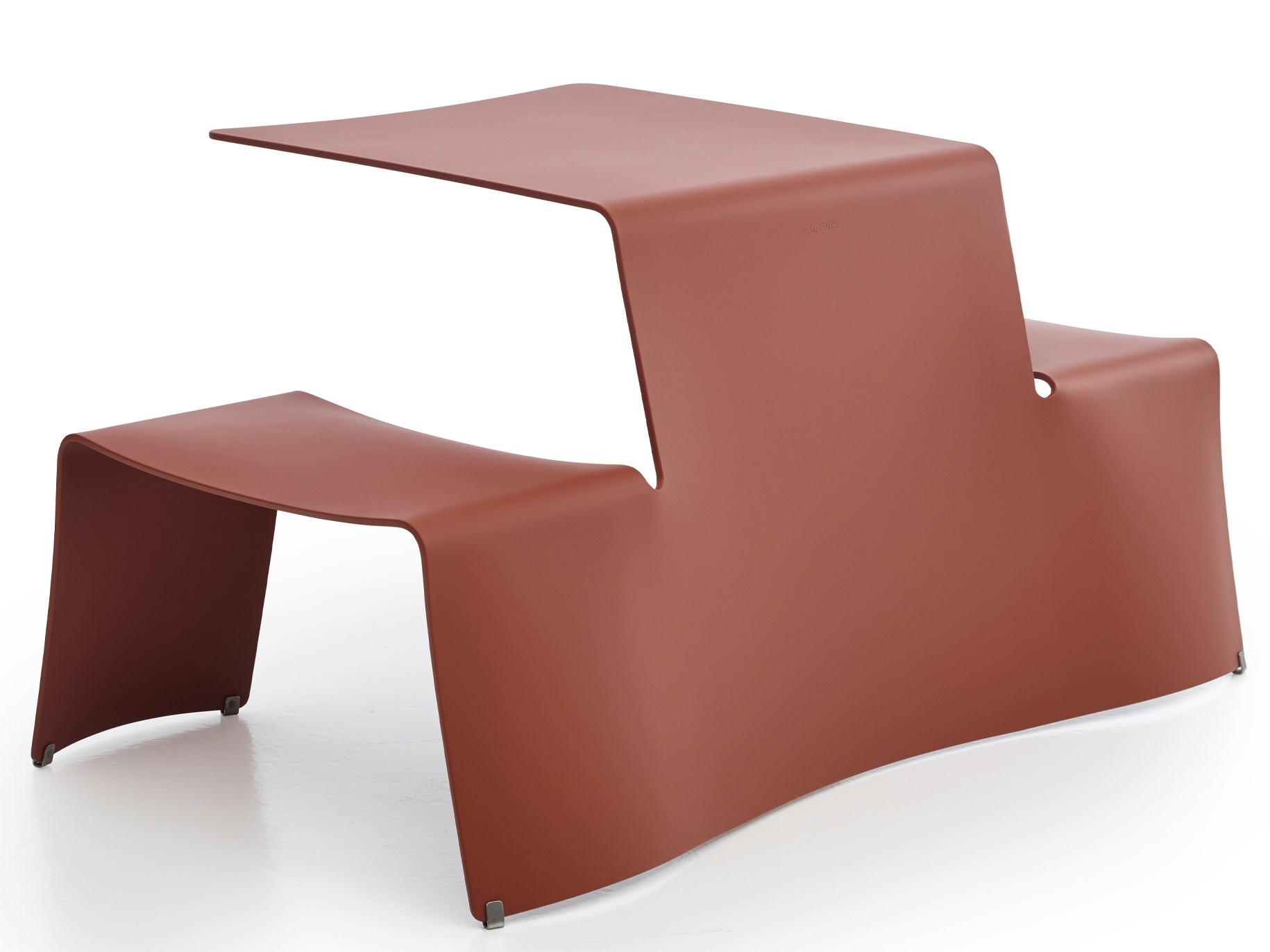 Functionaliteit ontmoet kunst. Het resultaat? Onze Picnik. De strategische uitsnijdingen en plooien in een enkele standaard aluminiumplaat zorgen voor een buitengewone eenvoud. De iconische rondingen maken de Picnik-tafel uitzonderlijk sterk, comfortabel en ze helpen het water gemakkelijk af te voeren waardoor deze tafel een perfecte match is om zowel op een terras, in een park of in eender welke binnenruimte te plaatsen.