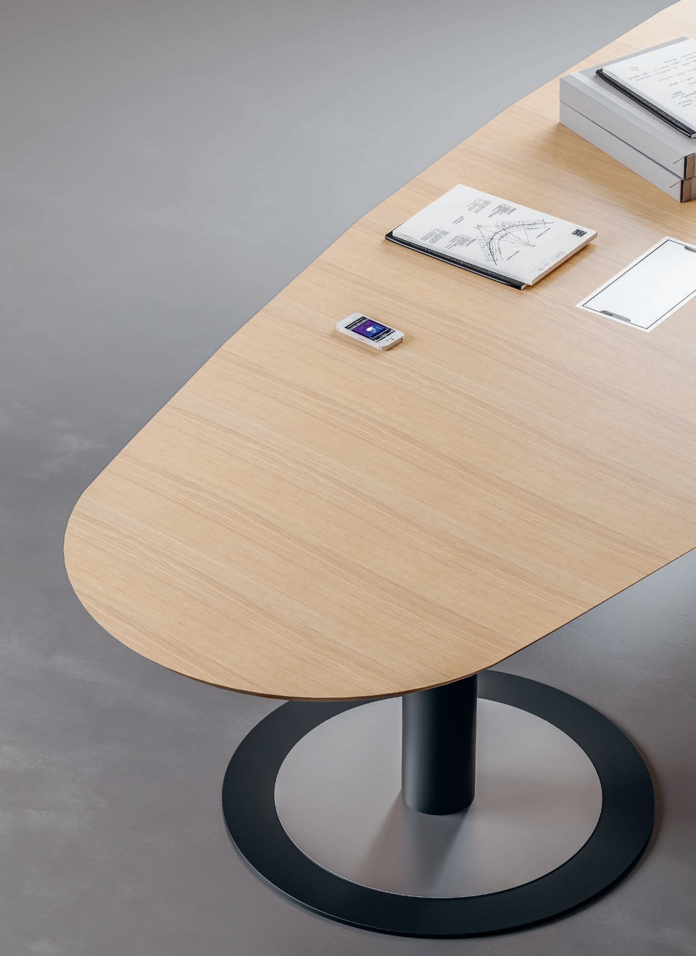 Fantoni presenteert een complete collectie van design vergadertafels, met een vast formaat blad, of in een modulair formaat om uw eigen composities te maken en te voldoen aan een zo breed mogelijk scala van behoeften. Tafelbladen kunnen worden geleverd met een melamine afwerking. De ovale vergadertafels worden ondersteund door een solide zwarte kolom op een schijfvormige basis, vervaardigd in staal. Het blad is vervaardigd in 28 mm dik MDF. De tafel is 360 cm lang en 120 cm breed.
