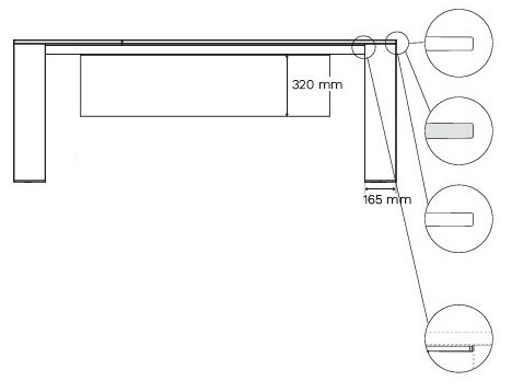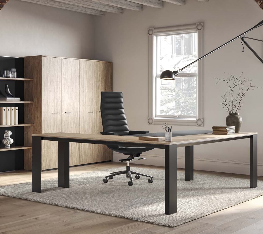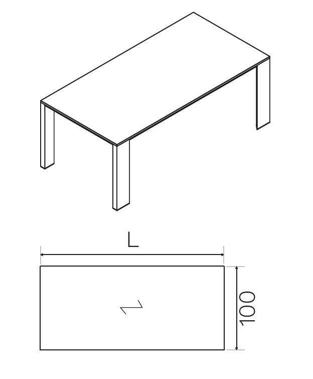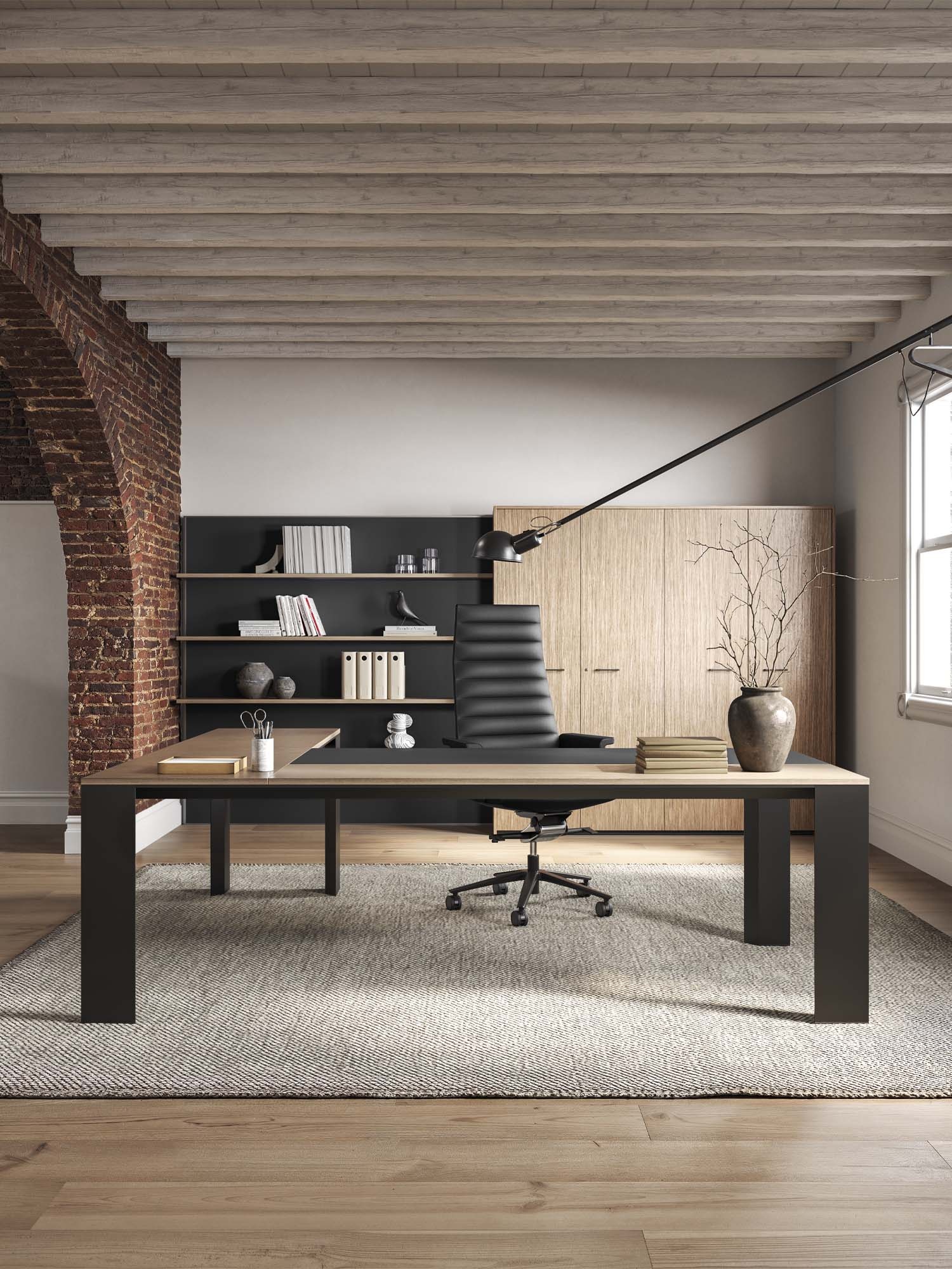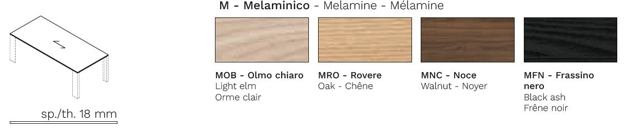 Een dun melamine blad rust op een stevig frame dat verborgen is achter een aluminium rand. De bijzondere esthetische uitsparing in het profiel van het bureau maakt het gemakkelijker om de stoel met armleuningen naast het werkblad te plaatsen.
