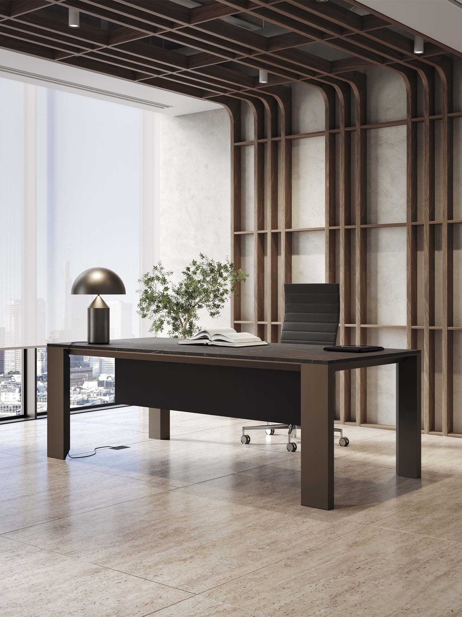 Het luxe ontwerp van het Frezza Ono bureau wordt gekenmerkt door de robuustheid en elegantie van de aluminium structuur. De aanzienlijke afmetingen van het Ono-luxe bureau van metaal, met werkbladen van 180 tot 240 cm en werkhoogte is 75 cm, maken het tot een symbool van leiderschap.