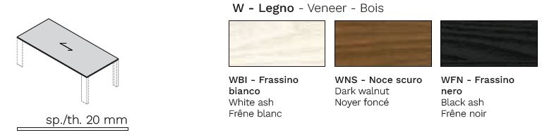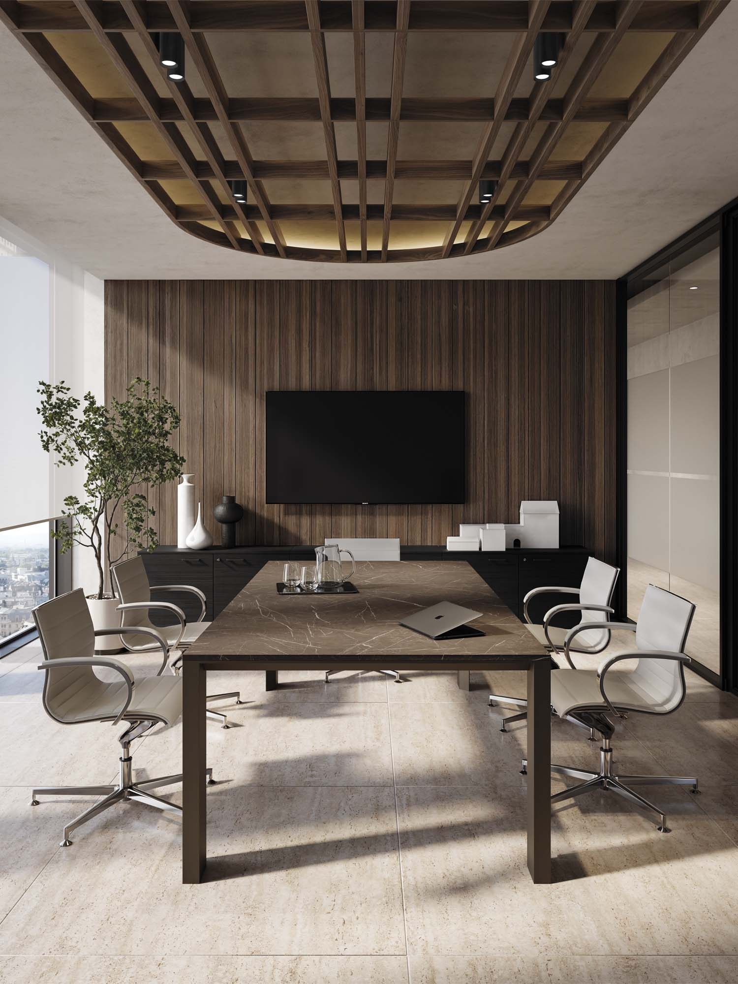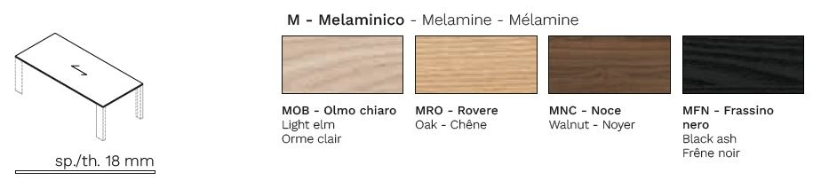 De flexibiliteit van deze verfijnde tafels ligt in het brede scala aan afwerkingen en de mogelijkheid om te kiezen tussen twee soorten structuren: melanine of fineer. Beide geven een nieuwe interpretatie aan het concept van vergadertafels, met behoud van een band met de traditie. Combinaties van verschillende materiaalsoorten bepalen het meest klassieke karakter van de vergadertafels.