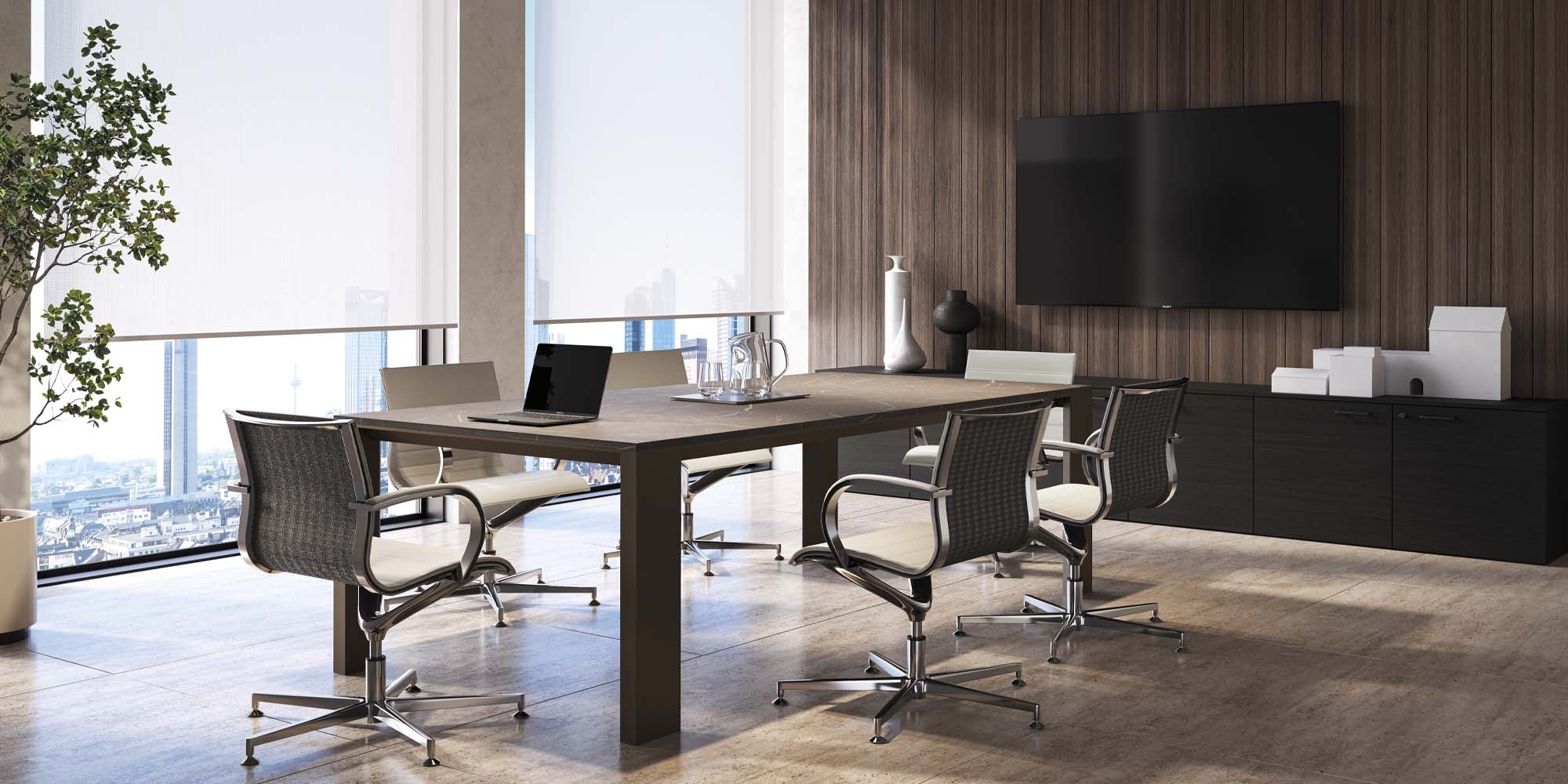 De vergadertafels uit de Frezza Ono-collectie zijn een mix van elegantie, degelijkheid en formele helderheid die in de loop van de tijd onveranderd blijft.