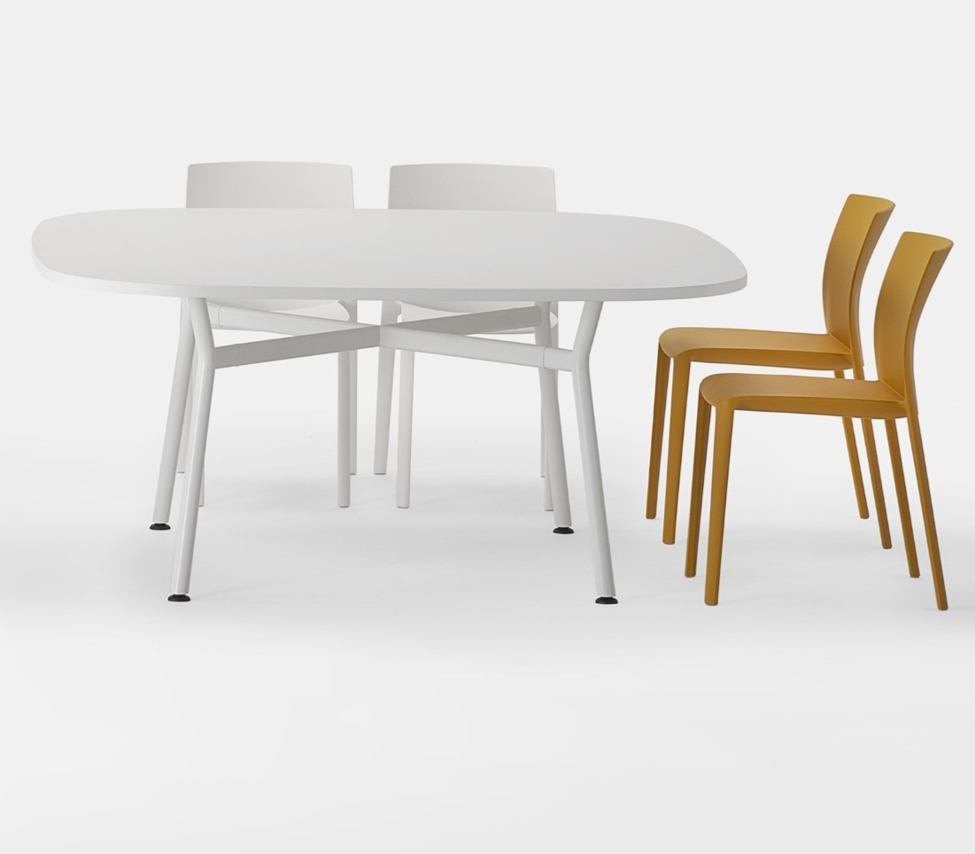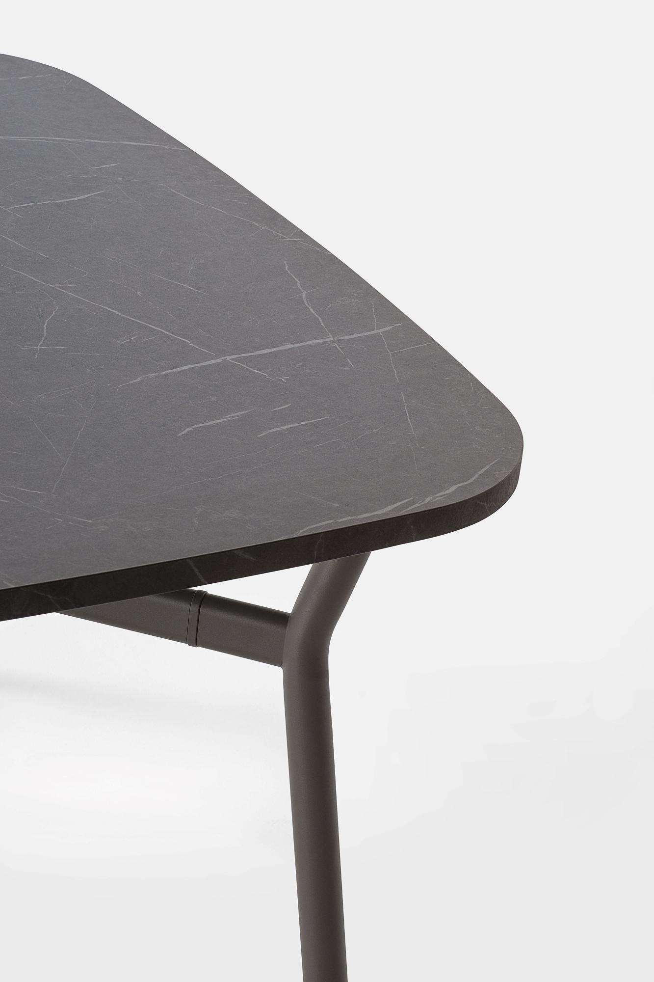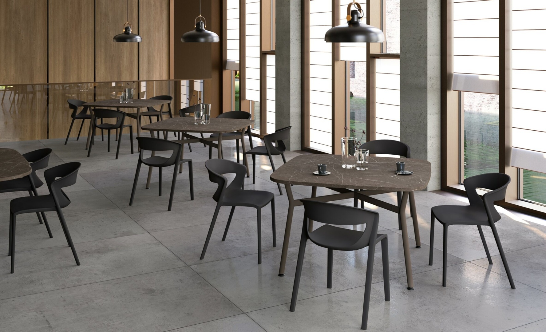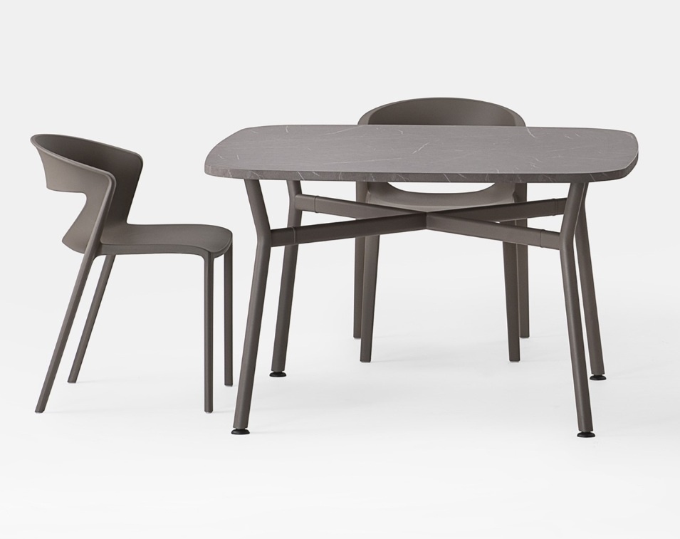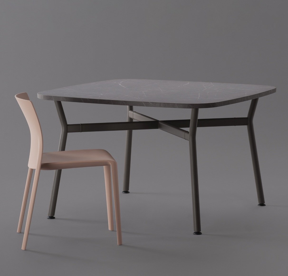 De Kairos tafel van het Italiaanse Kastel is een tafel die evenwicht en lichtheid in één enkel gebaar omarmt en het moment van een kleine bijeenkomst omzet in een ervaring van authentiek delen. Het blad, gemaakt van milieuvriendelijk geregenereerd hout, gelamineerd en afgewerkt met een verfijnde rand, vertelt het verhaal van een herboren materiaal: elke vezel draagt de waarde van duurzaamheid in zich en nodigt uit tot aanraking, ontdekking en conversatie. De kruisvormige structuur tekent een essentiële en sculpturale architectuur. De solide, royale ronde buis ontmoet de ovale horizontale verbindingselementen en creëert zo een onzichtbare, krachtige ondersteuning, perfect in balans tussen industriële precisie en formele verfijning. Kairos is een uitnodiging om te ontwerpen en elkaar te ontmoeten rond een elegant object dat de Bauhaus-esthetiek combineert met een groene ethiek.