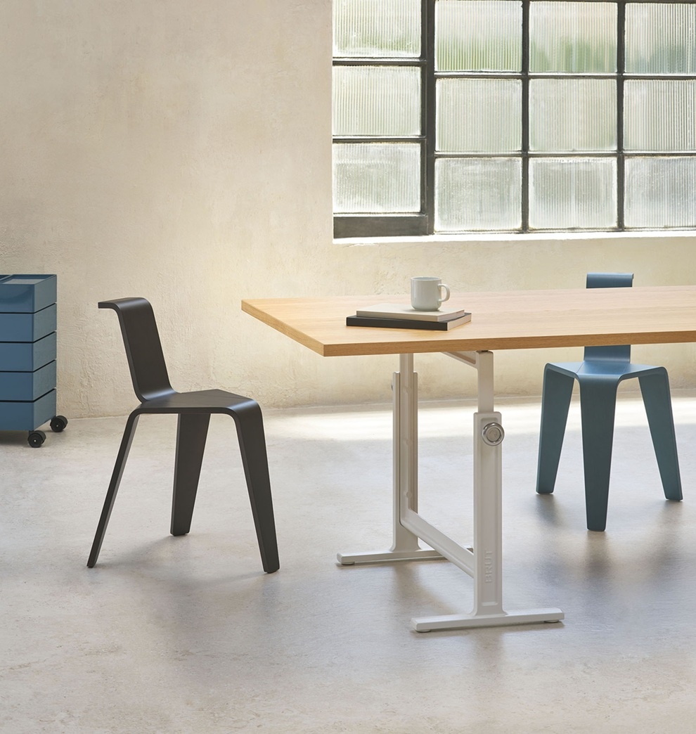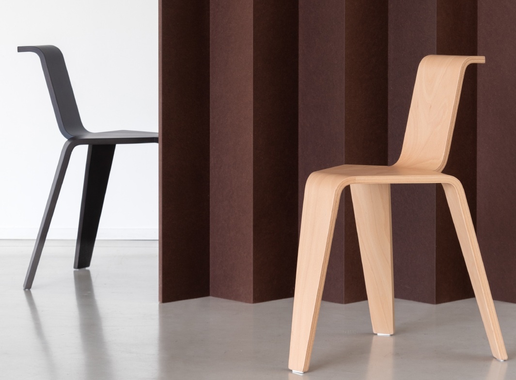 Konstantin Grcic: "AKA combineert de functionaliteit van twee stoelen in een strakke geometrie die dynamische en onconventionele manieren van zitten aanmoedigt”