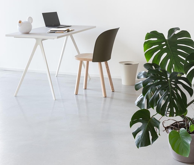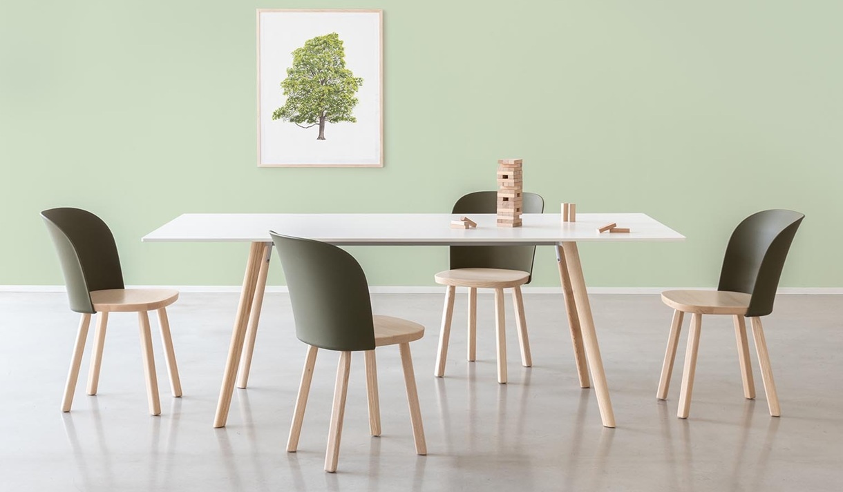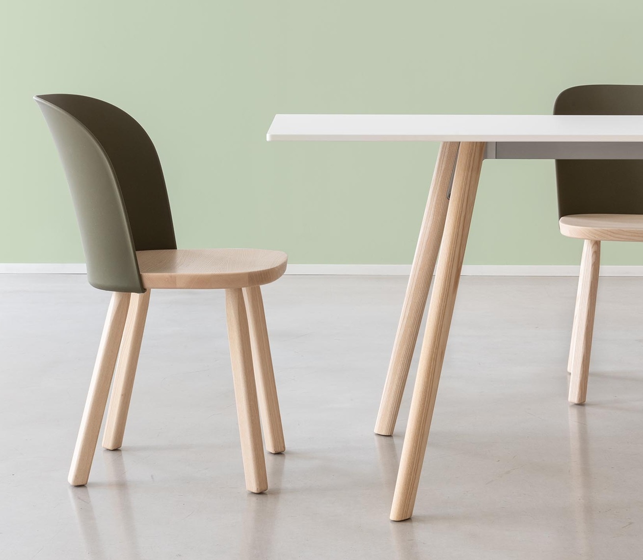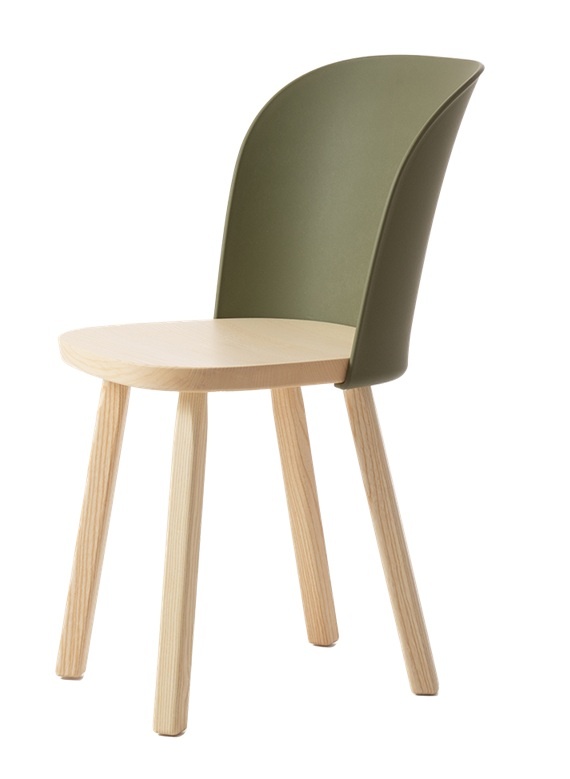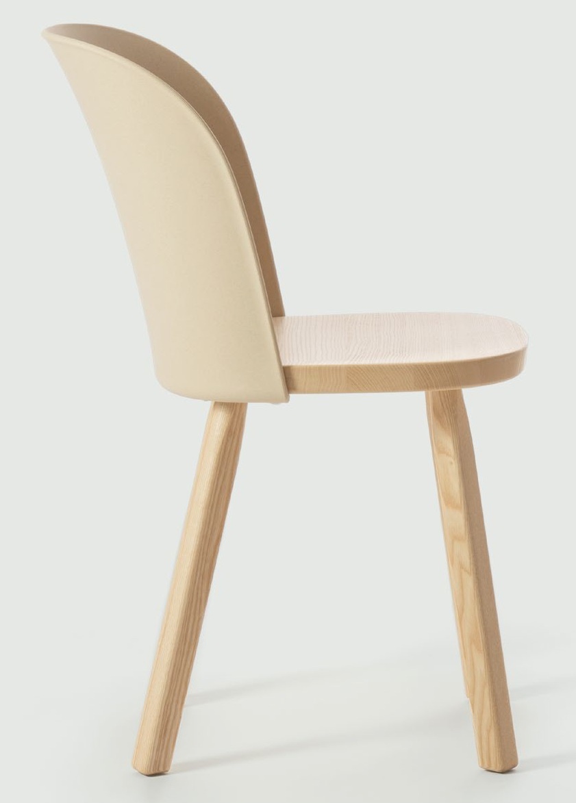 Materialen: zitting en poten van massief essenhout, rugleuning in bio-geproduceerd polypropyleen.
