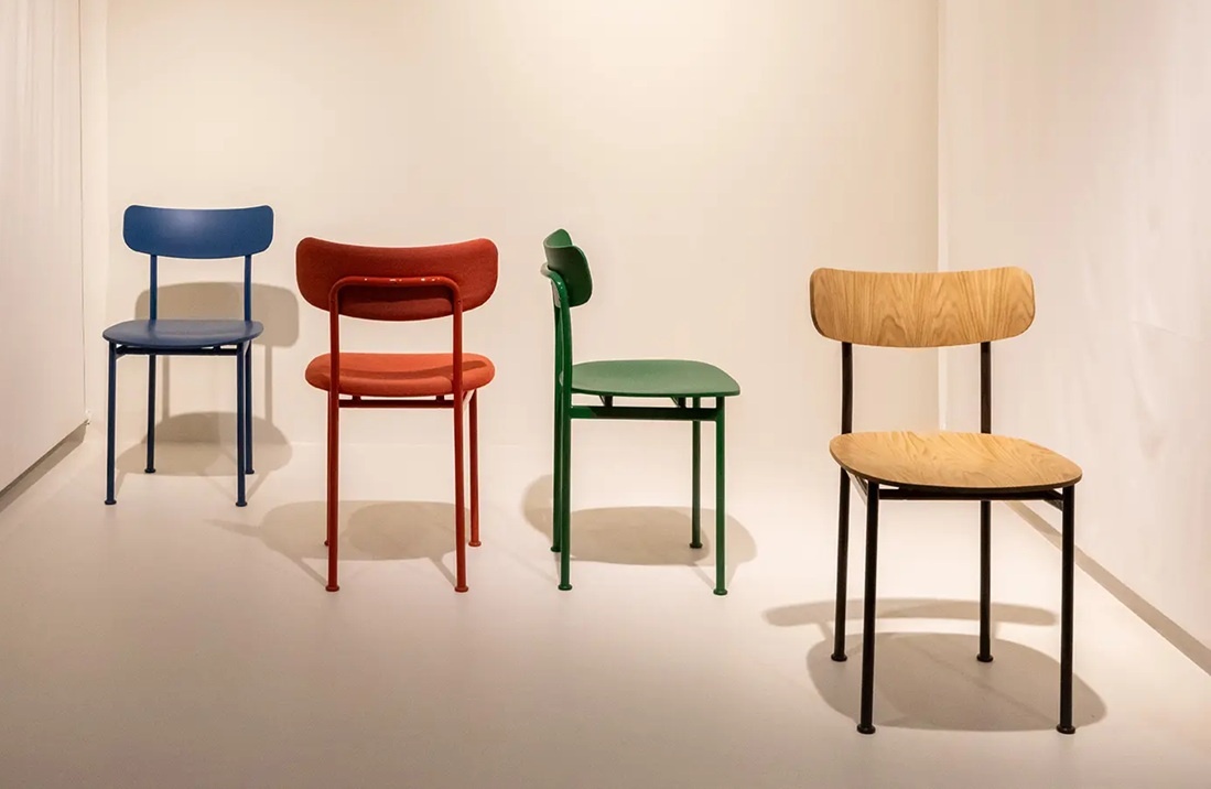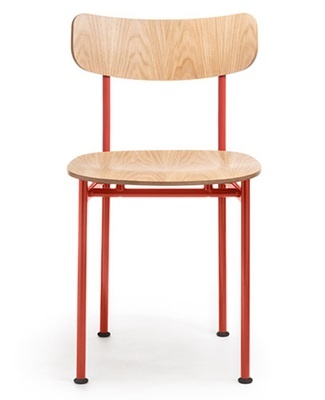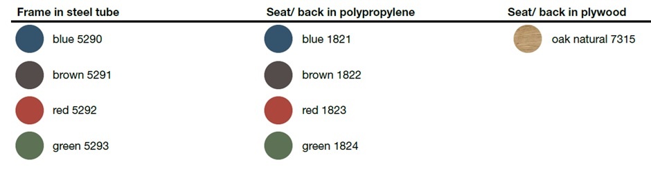 De stoel is verkrijgbaar in vier kleuren: oranje, groen, blauw en bruin en eiken multiplex.