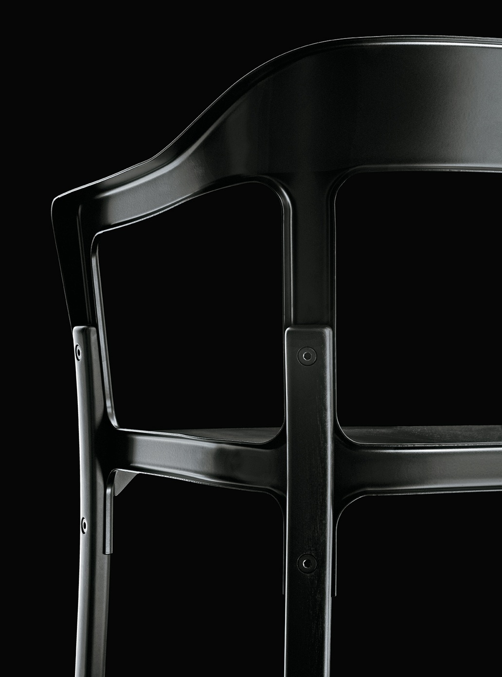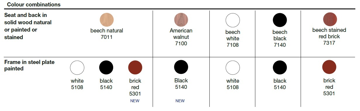 De poten en zitting zijn gemaakt van massief beuken, naturel of geverfd of gebeitst, of in massief Amerikaans walnoot naturel. Het frame wordt in staalplaat uitgevoerd, geverfd in polyesterpoeder. De poten zijn uitgerust met viltjes. De zithoogte van de stoel is 45 cm.
