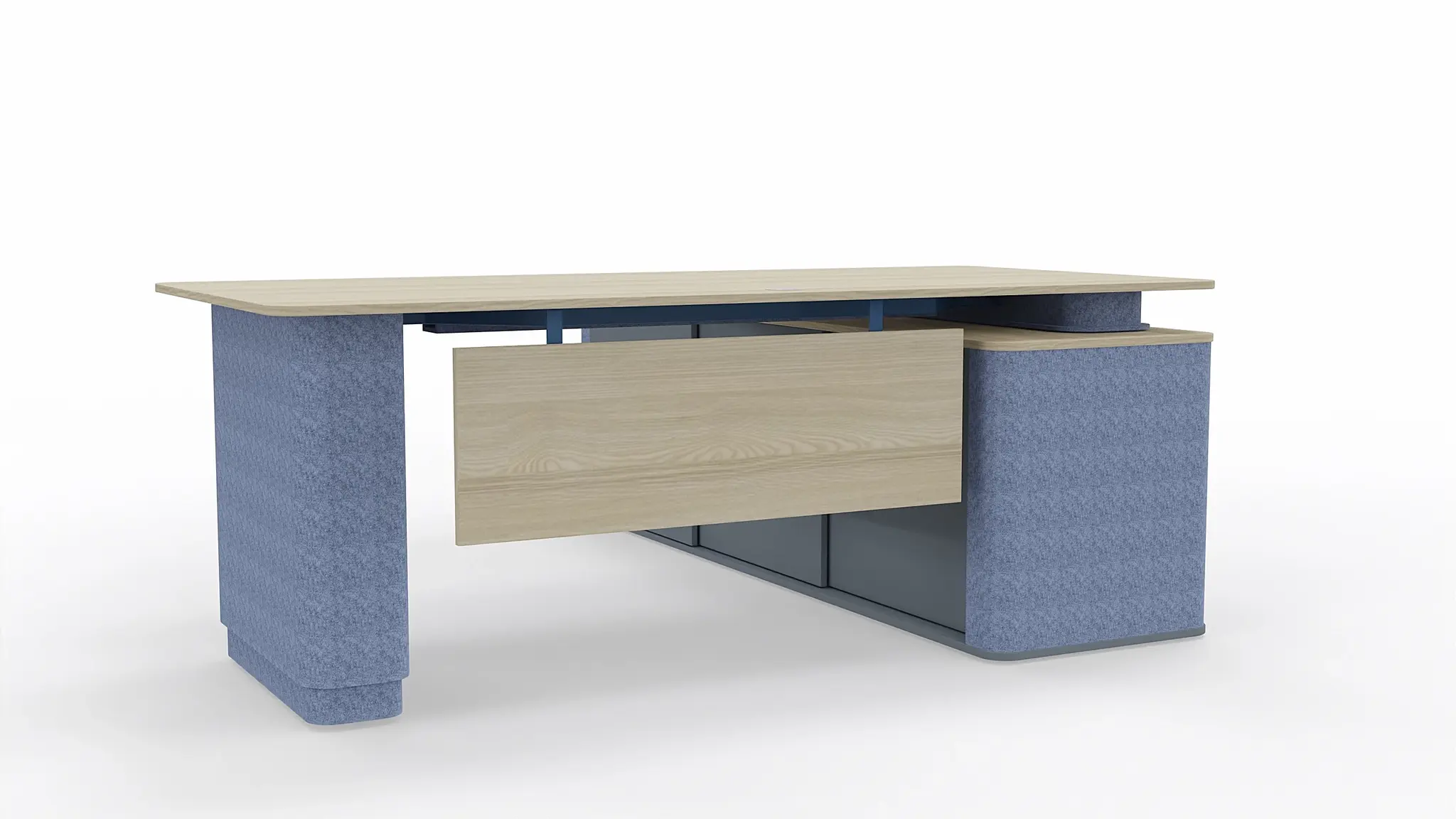 Het dressoir is 220 x 60 x 67 cm (lxbxh) en naar keuze links of rechts te plaatsen en voorzien van ruime opbergladen met volledige uittrekbaarheid en softclose-functie. De vilten panelen aan de zijkant geven het meubel niet alleen een warme uitstraling, maar bieden ook een licht akoestisch effect, wat zorgt voor extra rust in de werkruimte. Optioneel leverbaar met een centraal geplaatste kabeldoorvoer (Ø 80 mm) verkrijgbaar in 4 verschillende kleuren.