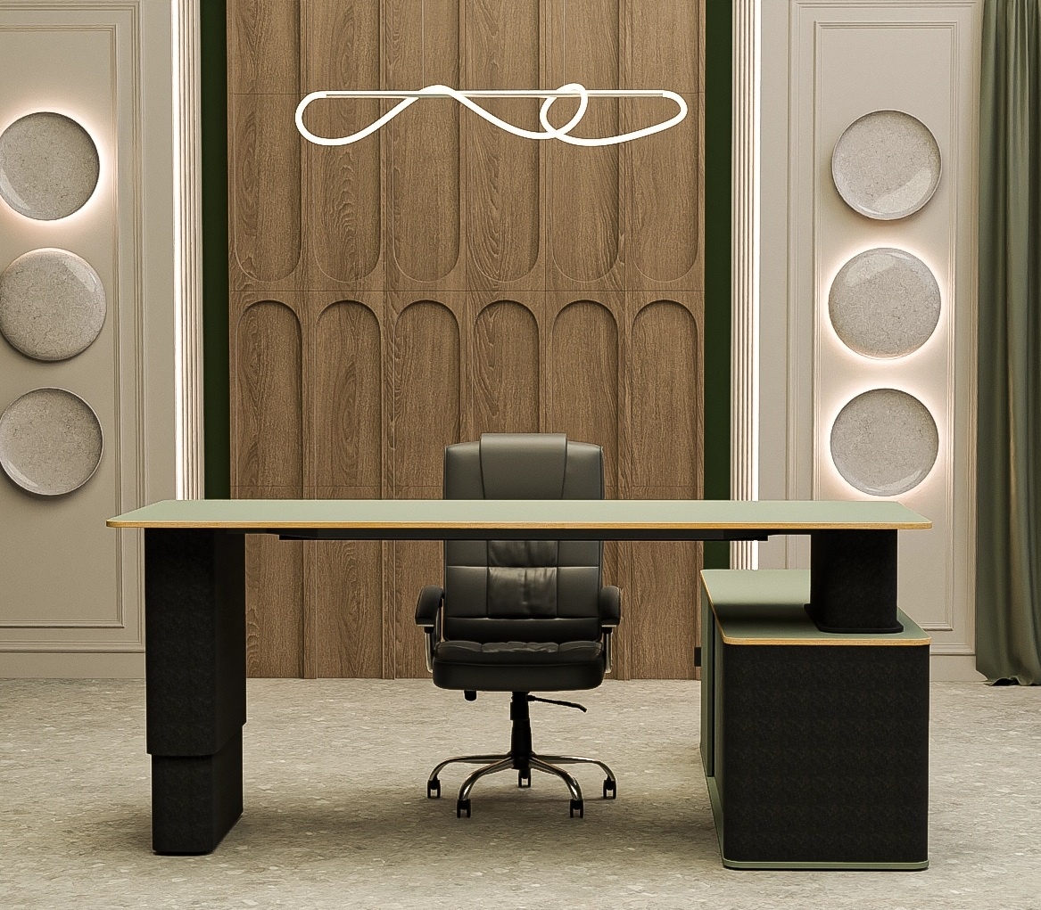 Ontdek de Eleganza elektrisch verstelbare management bureau met dressoir, een premium werkplek waar luxe design en functionaliteit samenkomen. Het bureau is verstelbaar van 63 tot 127 cm, waardoor je moeiteloos schakelt tussen zitten en staan. Met keuze uit 19 melamine bladkleuren, 7 viltkleuren voor de dressoirpanelen en 9 metaalafwerkingen personaliseer je het ontwerp volledig naar jouw stijl.
