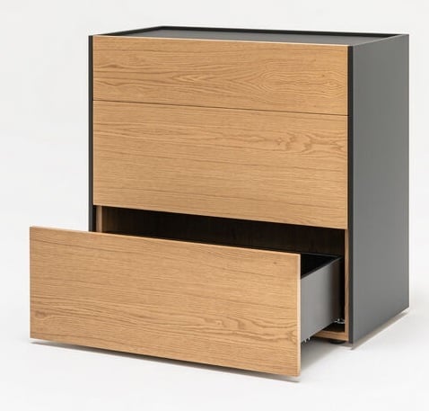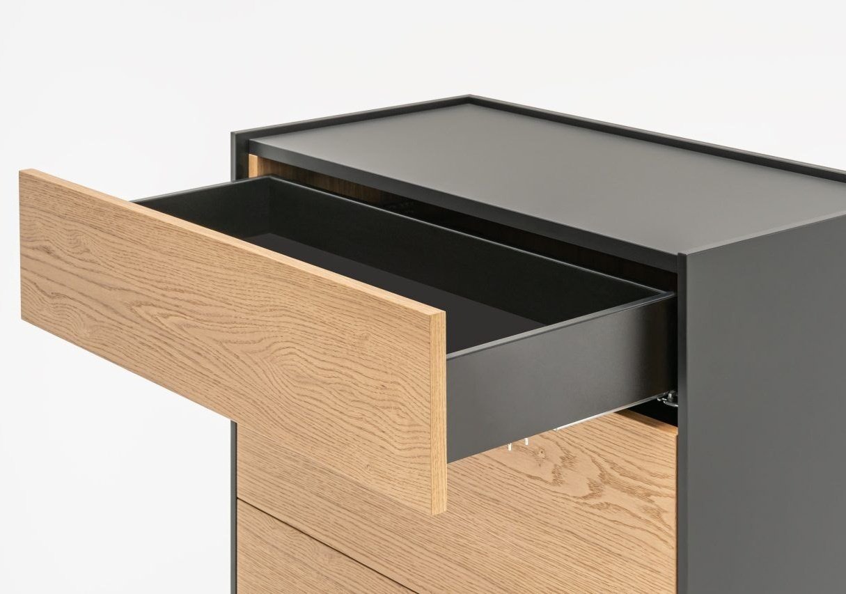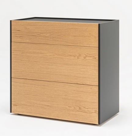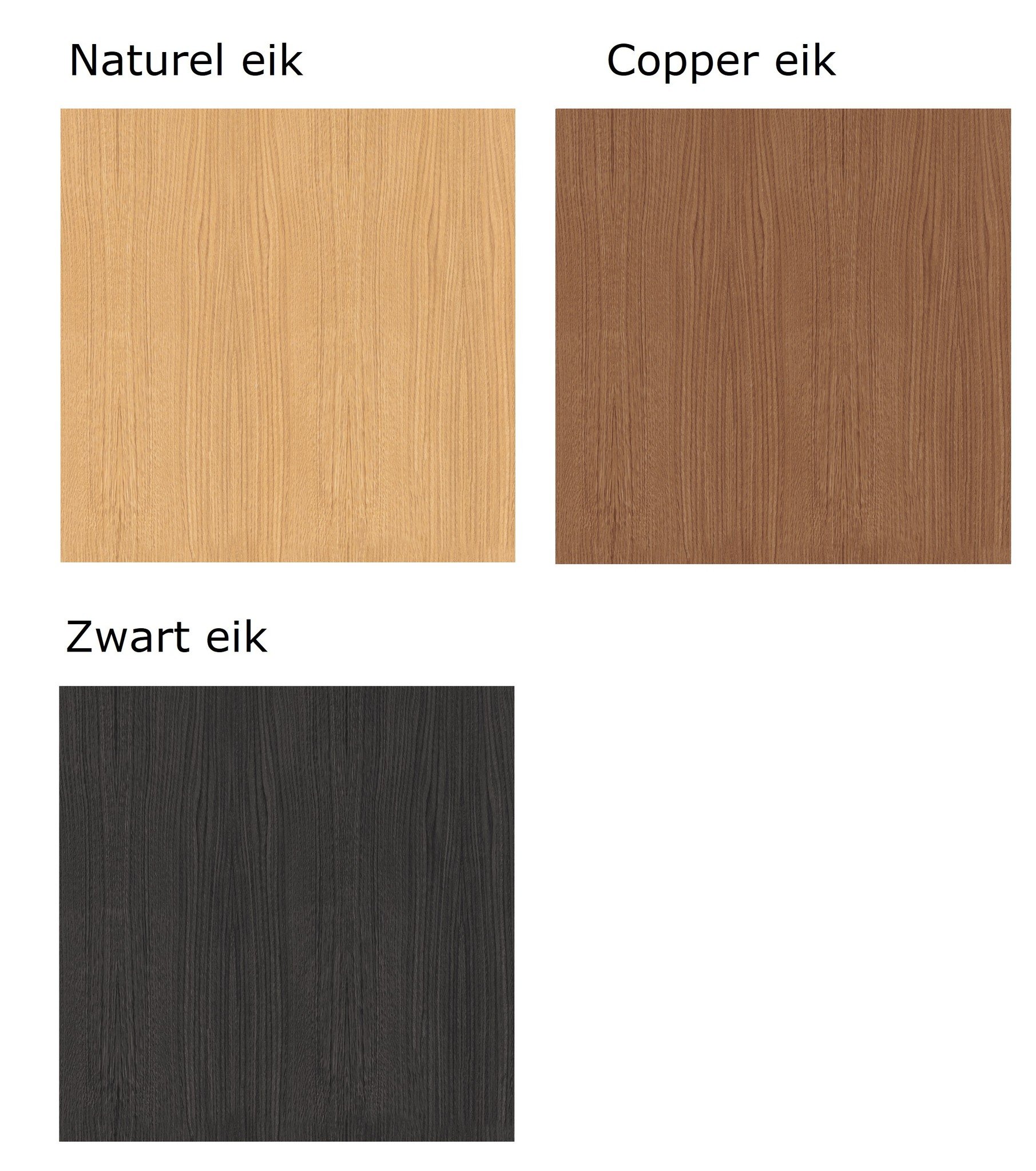 De kast heeft 3 lades en is 83 cm breed. De hoogte van de kast is 80,7 cm met een diepte van 42,4 cm. De buitenkant en bovenkant van de Viga kast is altijd zwart HPL Fenix, wat fluweelzacht aanvoelt en geen vlekken of vingerafdrukken nalaat. De lades en binnenkant zijn er in 3 kleuren: Naturel eiken, het wat donkere Copper eiken en donker eiken.