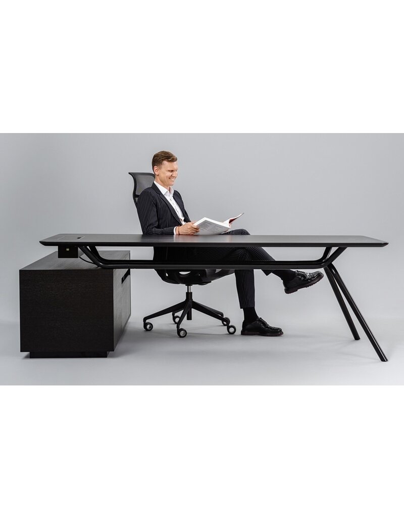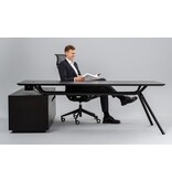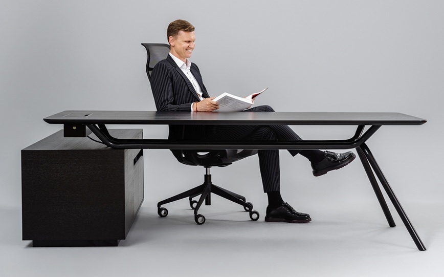 Het Arqus directiebureau van Narbutas valt op door de opvallende metalen poot die extreem stevig is, maar het bureau toch een gevoel van lichtheid geeft en het onderscheidt van andere producten. En het asymmetrische bureaublad is een ander detail waarmee u een werkruimte kunt creëren die afwijkt van de gebruikelijke. De subtiel afgeronde vormen en lijnen van Arqus komen samen om een vlekkeloos ontwerp met een onderscheidend karakter te creëren. Door het gebruik van afwerkingen zoals fineer en natuurlijk leder wordt de luxe uitstraling van het directiemeubilair verder versterkt.