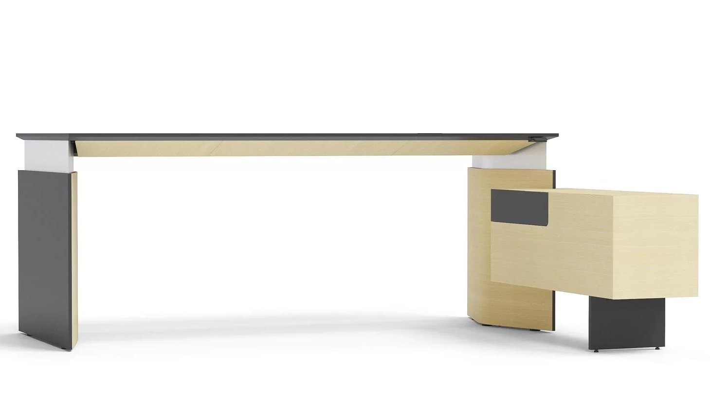 Het Move&Lead directie bureau met vast dressoir van Narbutas is een minimalistisch, elegant en functioneel executive kantoormeubelsysteem voor een moderne leider. Het helpt om onderweg te blijven en actief te zijn, zelfs aan een bureau. Blijf bewegen, blijf gezond en productief.