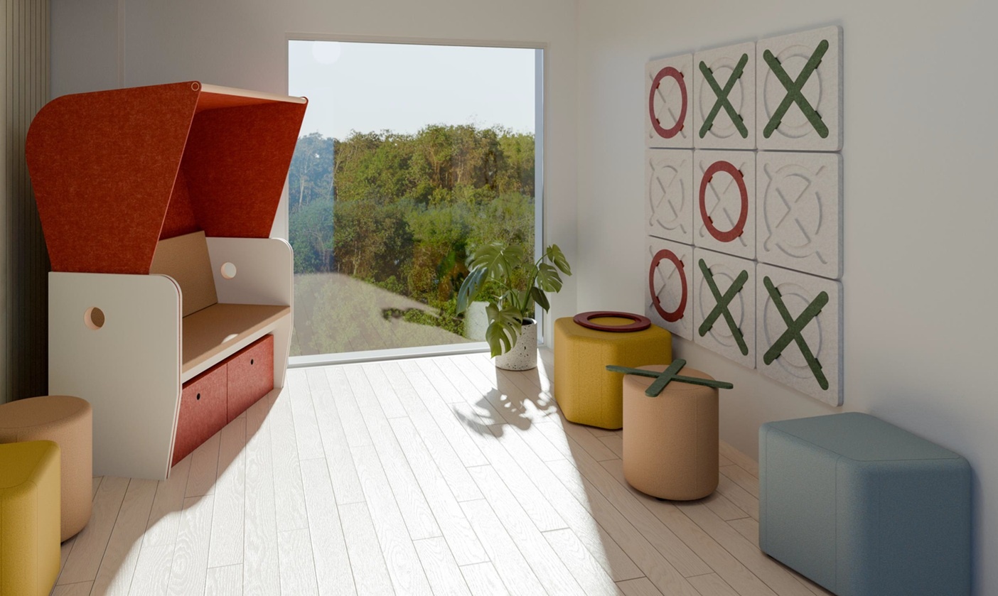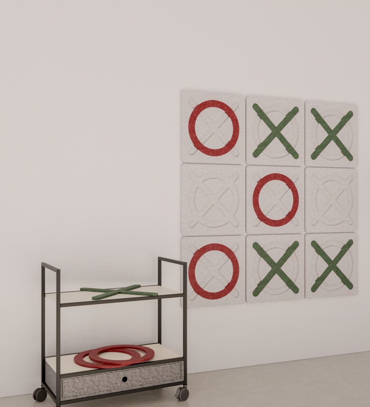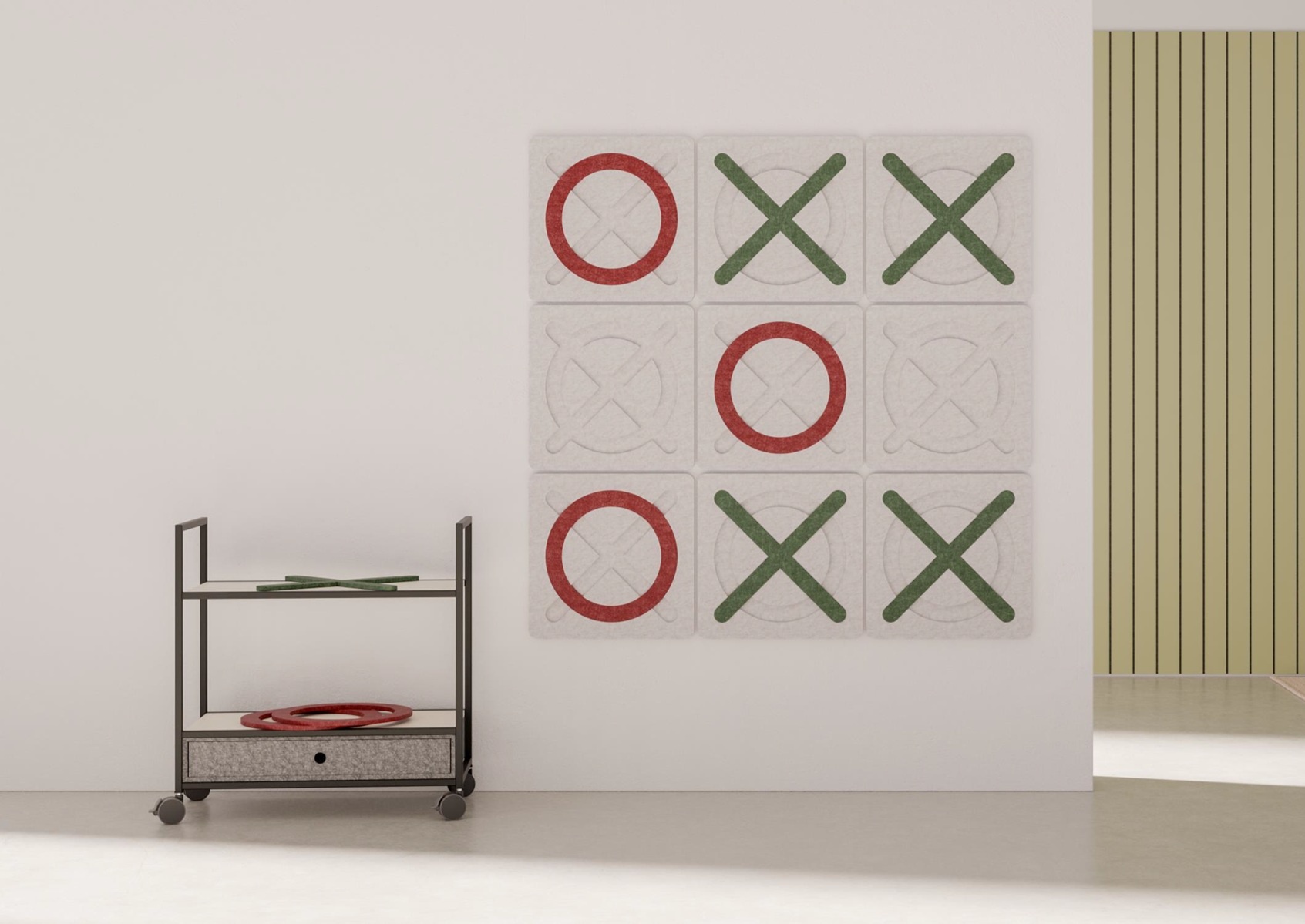 Dit unieke akoestische paneel combineert design en functionaliteit op een speelse manier. Het paneel is vormgegeven als het bekende kruisje-rondje spel (Tic-Tac-Toe) en kan daadwerkelijk gebruikt worden om te spelen. Ideaal voor kantoren, wachtruimtes of creatieve omgevingen waar akoestiek en beleving samenkomen. De zachte, geluidsabsorberende materialen verbeteren de akoestiek in de ruimte, terwijl het opvallende ontwerp zorgt voor een uitnodigende en interactieve sfeer. Verkrijgbaar in diverse kleurencombinaties en eenvoudig te monteren. Dit paneel is niet alleen een geluidsoplossing, maar ook een origineel gespreksonderwerp aan de muur.