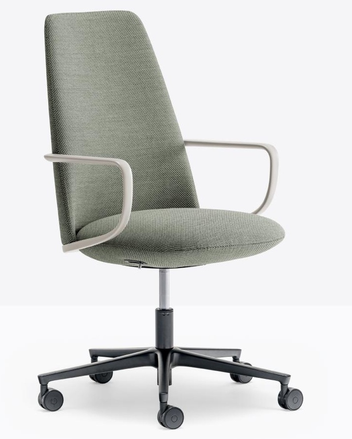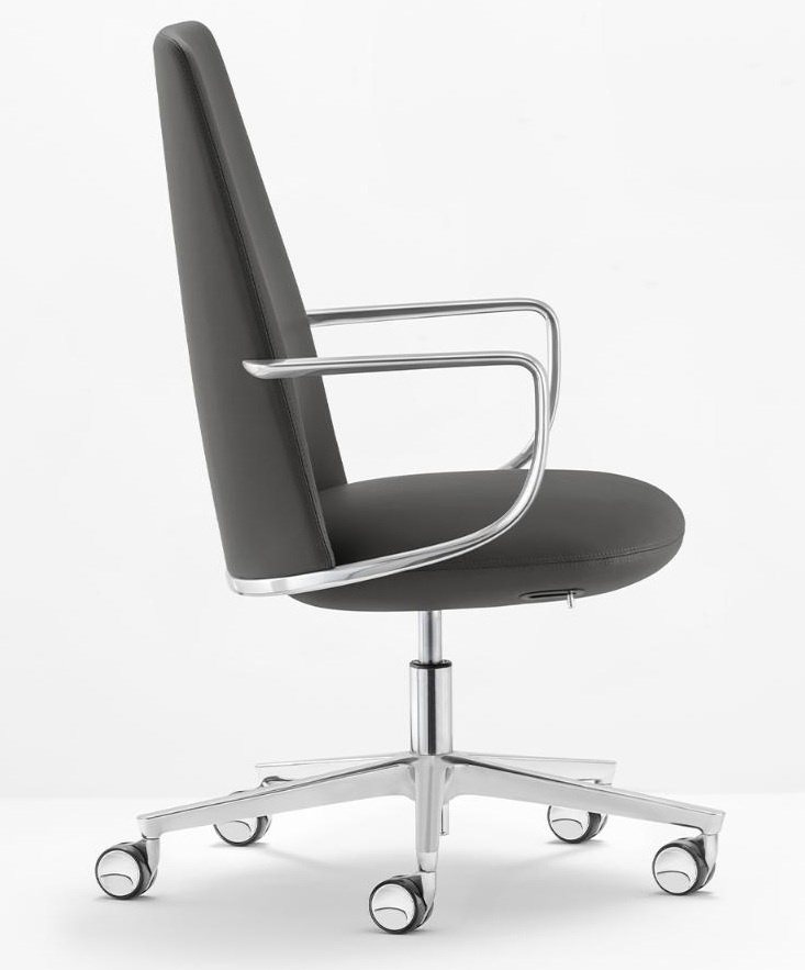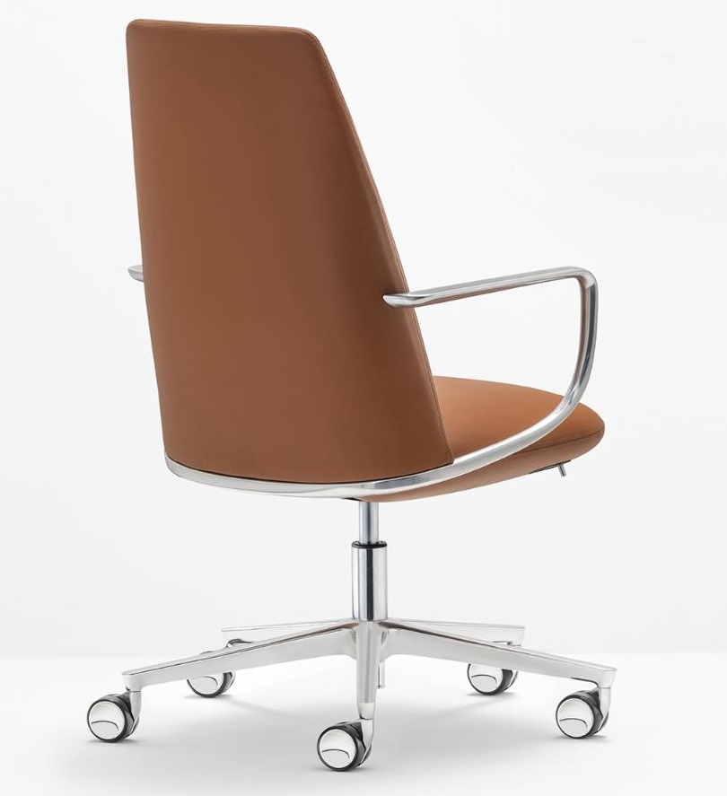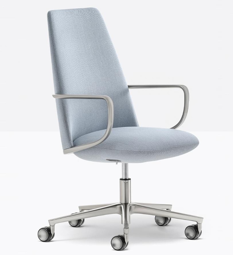 De Elinor stoel van het Italiaanse designmerk Pedrail is een directiestoel met een lagere rugleuning, ontworpen om naadloos te passen in zowel vergaderruimtes, directiekantoren als woonomgevingen. De in hoogte verstelbare voet van gegoten aluminium wordt gekenmerkt door esthetisch aantrekkelijke, golvende lijnen. Een gewichtsgestuurd synchroonmechanisme dat in de gestoffeerde zitting is geïntegreerd, zorgt ervoor dat de kanteling automatisch wordt aangepast aan het lichaamsgewicht van de gebruiker, zodat de rug in de meest comfortabele positie blijft. Andere sterke punten van elinor low back zijn het comfort en het gevoel dat de stoel zich om het lichaam heen vormt, dankzij het polyurethaan schuim dat in zowel de zitting als de rugleuning is geïnjecteerd. Een lichte, slanke, sterke armleuning van gegoten aluminium bepaalt met zijn vloeiende lijn de basis van de rugleuning.