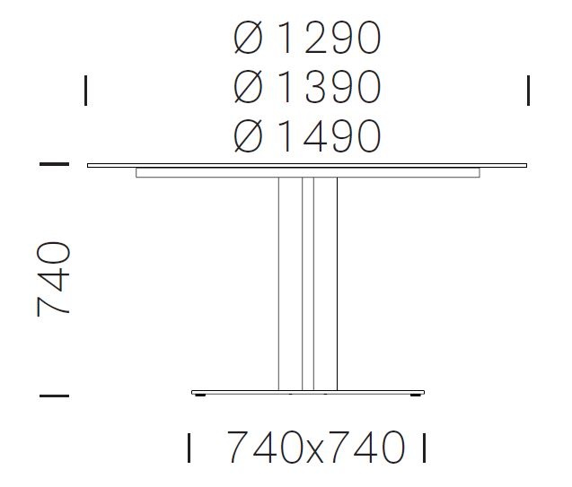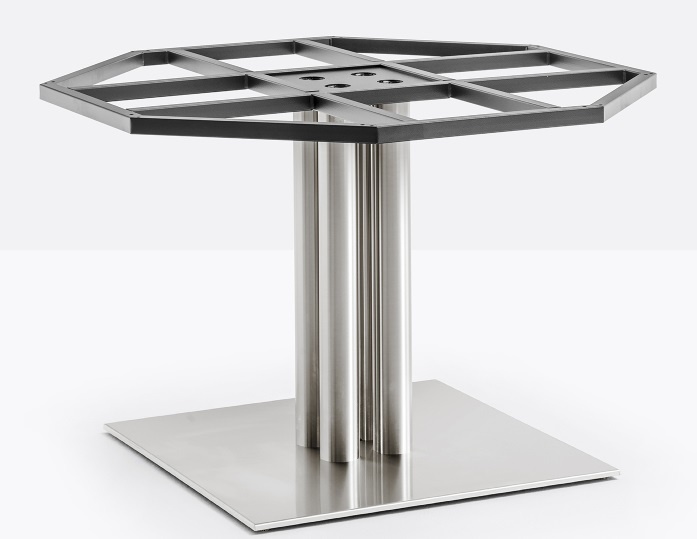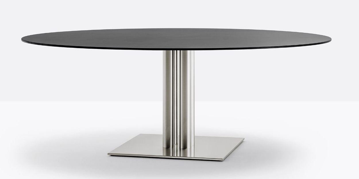 Pedrali Inox is een eenvoudige en functionele tafel, gekenmerkt door een geometrie die hem geschikt maakt voor verschillende contexten, zoals in een vergaderruimte als vergadertafel of als eettafel in een restaurant, hotel of eetkamer. De voet is een vierkante plaat van 74 x 74 cm, terwijl de centrale kolom bestaat uit vier naast elkaar geplaatste buisvormige elementen. De tafel is er in de maten Ø 129 cm, 139 cm en 149 cm. De werkhoogte van de tafel is altijd 74 cm.