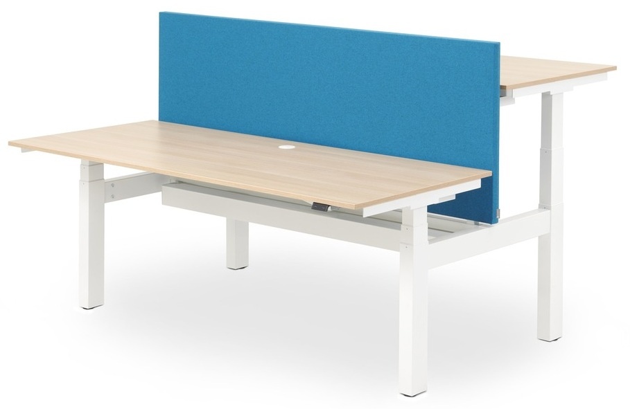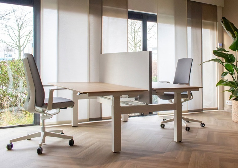 Voortman Hi Tee Duo Zit-sta bureau 2 personen: voldoende beweging op kantoor is belangrijk. Met zit-sta werkplekken wordt een actieve werkhouding bevorderd. De vorm van de Hi Tee Duo Zit-sta werkplek stimuleert de onderlinge samenwerking terwijl de werkbladen individueel verstelbaar zijn.