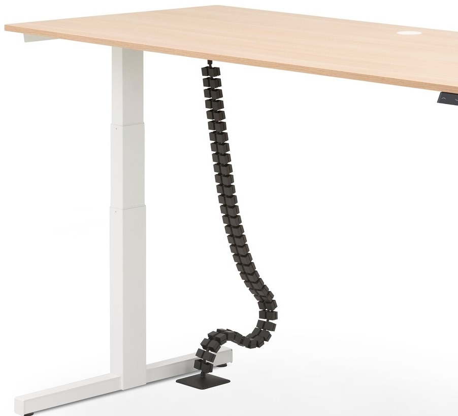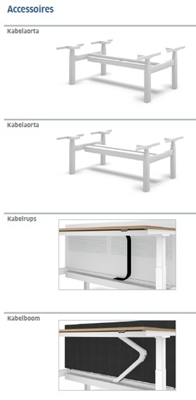 Door een kabeldoorvoer in het werkblad van de Hi Tee Duo Zit-sta en een horizontale kabelgoot onder het werkblad te plaatsen worden snoeren, opladers en stekkerblokken netjes opgeborgen en blijft werkvlak vrij. Bij verstelling van zit-sta werkplekken worden verticale kabels met passende lengte in de kabelgoot gefixeerd, waardoor kabelbreuk of afklemming wordt voorkomen. In de kabelgoot met deksels worden restbekabeling en aanvullende stroomvoorzieningen opgeborgen.