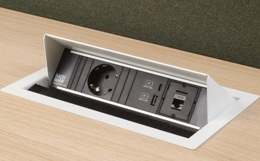 Voorzieningen van de Voortman Hi Tee Duo Zit-sta voor netstroom, USB A en C, netwerk en draadloos opladen kunnen optioneel en naar wens in het werkblad en door een klep afgeschermd gemonteerd worden.