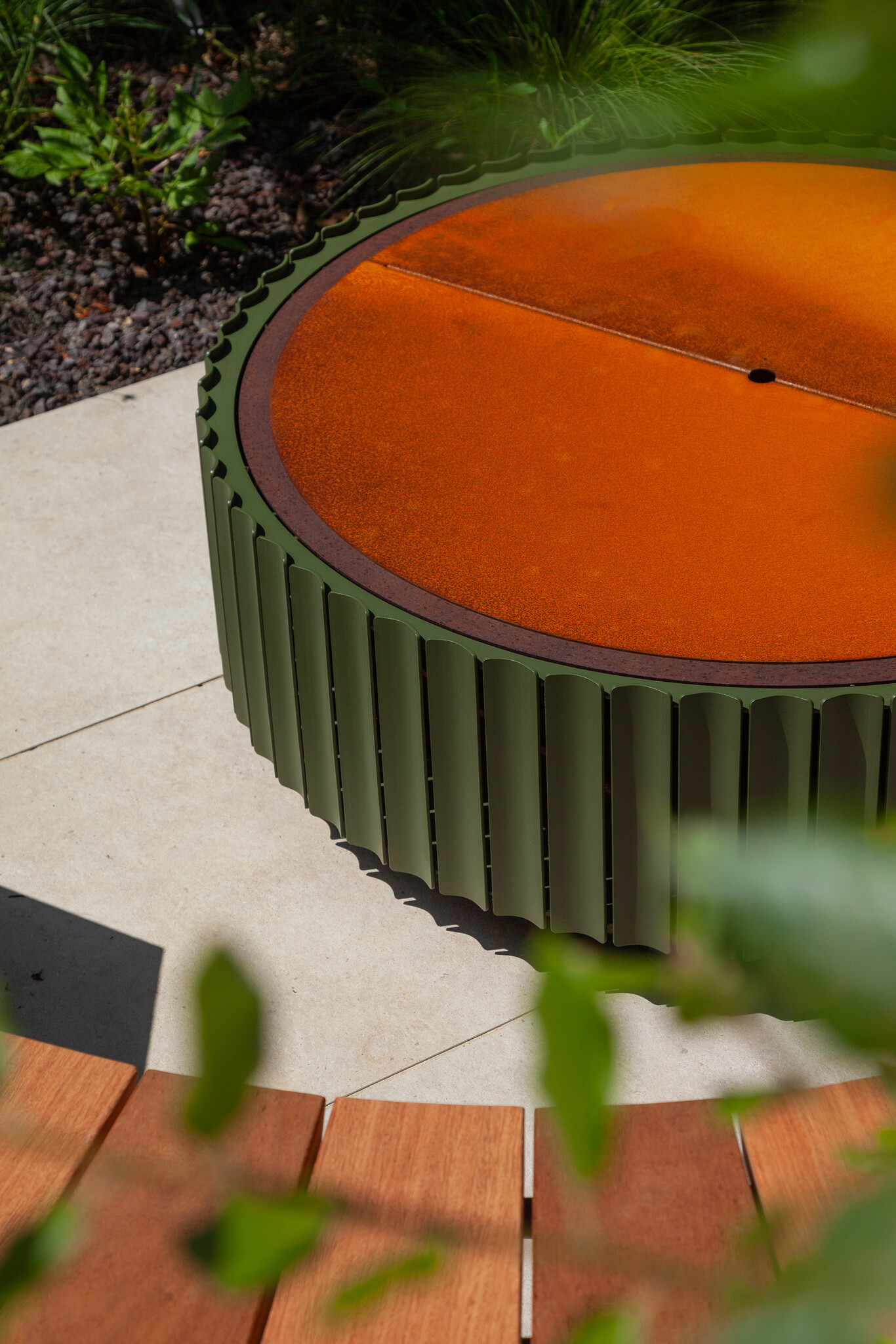 Uitnodigend, warm en stoer. The Ring vuurschaal incl. aslade is verkrijgbaar in 2 kleuren, olijfgroen RAL6003 en Cortenstaal, en heeft een royale diameter van 105 cm, hoogte 35 cm en weegt +- 60 kg en is gemaakt uit hoogwaardig cortenstaal wat tegelijk modern oogt en een onvermoeibaar duurzame laag vormt.